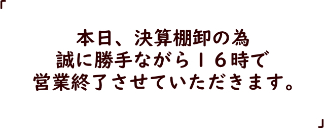 在庫品の棚卸のために誠に勝手ながら本日は16時で営業を終了させていただきます。
